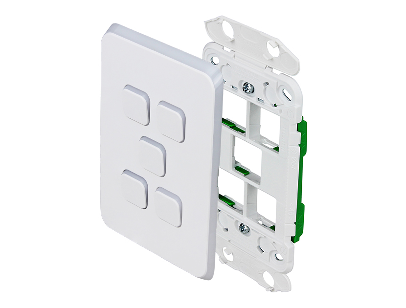 Clipsal Iconic 5 gang grid plate and skin for either vertical or horizontal mounting; Vivid White.